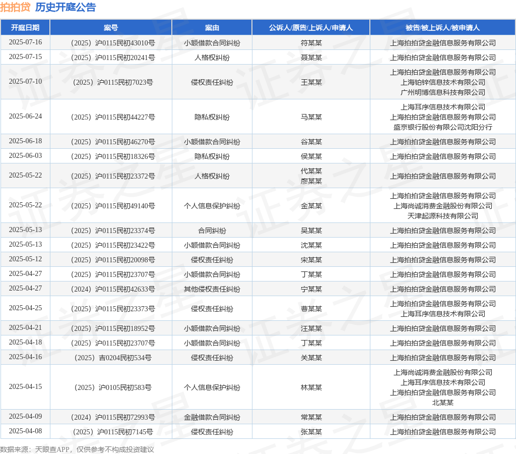 本站消息,根据天眼查APP显示,近日公布了一则上海拍拍贷金融信息服务有限公司作为被告/被上诉人的开庭公告,详细内容如下: